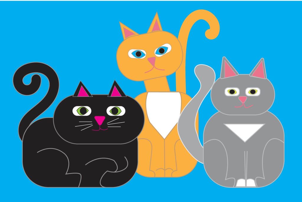 As far as what else is happening this week. I have been making progress on getting connected with the sites I need to to promote my illustration/graphics work and I have been really enjoying going through all the Adobe Illustrator tutorials. I decided to start from the beginning because there have been a lot of changes to the program and I know if I just try to go at it the way I used to work on it I will just get frustrated. See a re-scripting for me! Anyway it has been fun doing simple projects like the cats above. Although I miss the feel of the paper and the process of creating art in the traditional way, I really do enjoy graphic illustration and design too. It is important for me to do both everyday because each one is giving me things I need.