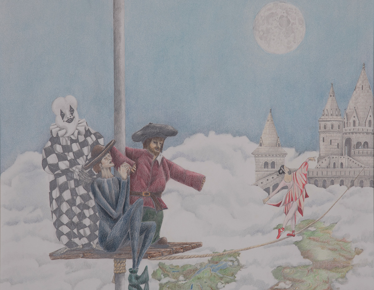 The pencil painting I am sharing today is called Letting Go, and I would have to say this is kind of a fairytale image. The princess heads off to the castle, dancing along a tightrope high in the clouds. She leaves behind 3 characters on a platform huddled together. I name them Death, Fear, and Greed. The princess is ready for a new life in a castle set in the sky, high above all the mediocrity of life below. What is the outcome of this fairytale? That is for you to decide, I leave the story open to your own interpretation.
